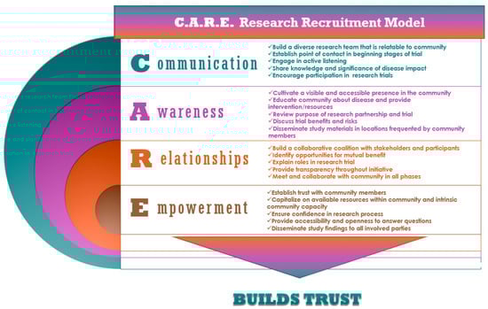 It can require additional investments of time and resources to learn which methods may work in African American communities to improve community acceptance of clinical research and thus improve participation. Prior studies suggest that researchers can be considered outsiders due to their cultural, educational, and economic backgrounds differing from the backgrounds of the group they are recruiting [18]. Our diverse research team was composed of individuals with similar backgrounds and/or understanding of urban African Americans to ensure that potential participants would relate and not view the researchers as outsiders. To overcome this barrier for the improvement of health outcomes, it is imperative that researchers utilize practices that consider the social and cultural aspects of the population they intend to study. Although there are governing principles and guidelines influenced by CBPR, there is no recommended model for community-based participatory researchers to follow when engaging African American research participants, so the C.A.R.E. model has the potential to fill that gap [15]. Although it was developed specifically for this targeted population, its strategies are not limited for use in African American populations.