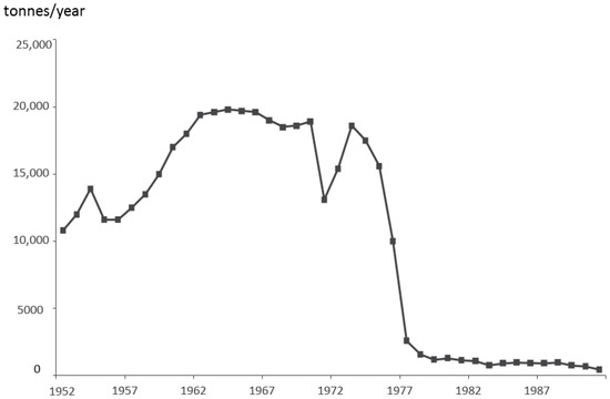 In this paper, the term “asbestos” is used to denote mixtures of fibrous forms of silicate minerals crystallized to form long and thin fibres mined and processed as raw materials, and sold under the commercial generic term asbestos. The mining of asbestos during the years 1965–1975 occurred mainly in exporting countries: Russia (the former Soviet Union), the People’s Republic of China; the United States; Brazil; Canada; Cyprus; the Balkan states of former Yugoslavia; and Australia. Estimates of this production was 95% chrysotile and 5% amosite or crocidolite asbestos. The worldwide production of asbestos in the years 1968–1978 has been estimated (in thousands of tonnes) as: 3291 (1968), 4598 (1973), and 5818 (1978). Imports of raw asbestos/asbestos products to Sweden (in thousands of tonnes) have been estimated as: 16.7/15.9 (1968); 18.7/14.8 (1978); 1.3/4.5 (1978), and 1.0/1.4 (1984). Imports of asbestos to Sweden from 1952 to 1991 are shown in Figure 1 ([2,3], p. 877, reused with the authors’ consent). There was a dip in the late 1960s, followed by a more permanent and rapid fall, reflecting the prohibition of asbestos spraying, from 1973 onwards.