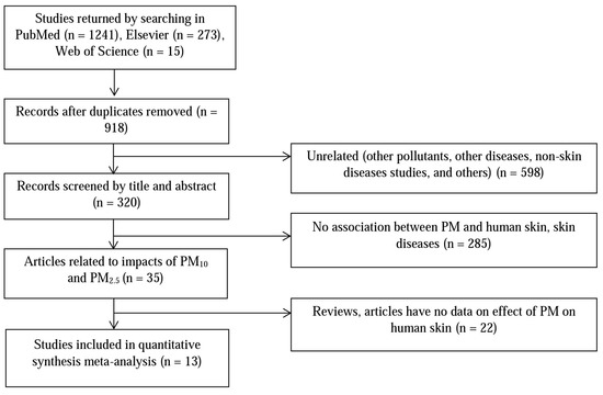 Bibliographic reference lists were manually selected for meta-analysis based on identifying associations between PM10, PM2.5, and human skin diseases, articles that presented no data (e.g., review articles and editorials) as well as articles written in languages other than English were excluded. The inclusion criteria for quantitative meta-analysis were estimates of diseases reporting data that could be used to calculate an estimate of the effect.