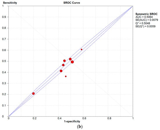 Summary receiver operating characteristic (SROC) curves of influences of (a) PM2.5, (b) PM10 on human skin.