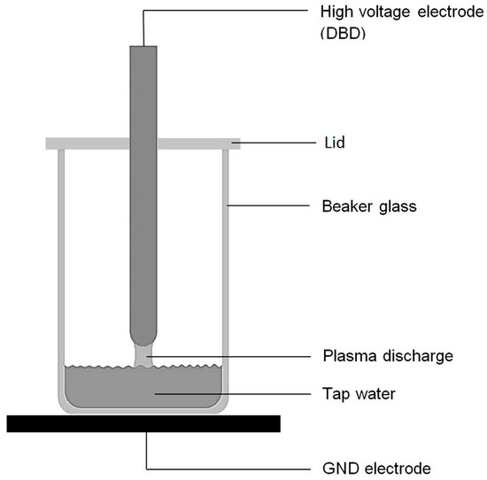 A dielectric barrier discharge was generated between a high voltage electrode and a water surface situated in a beaker glass in standard air as working gas (Figure 1). The high voltage electrode (HV-electrode) is composed of a copper powder core embedded in an Al2O3 ceramic. The ceramic is functioning as dielectric barrier (diameter ≈ 8 mm) producing a filamentary discharge at ambient pressure. High voltage was supplied via a power supply build in our laboratories giving the parameter set as displayed in Table 1. The high-voltage generation is based on the principle of a flyback converter. In addition to the usual design, a capacitor is located parallel to a switching transistor. Together with the primary winding of the high-voltage transformer, this setup forms a resonant circuit which is tuned to the resonance of a corresponding resonant circuit on the secondary side of the high-voltage transformer. The power is supplied via a 24 V DC-voltage source. The switching transistor is controlled by a microprocessor. The duty cycle of the transistor determines the amplitude of the generated high voltage. The switch-off time between two pulses is variable and selected in a way that ensures the remaining oscillation of the system to decay sufficiently, leaving the next high voltage pulse as unaffected as possible. Input parameter measurements were performed using a DLM2054 oscilloscope (Yokogawa, Musashino, Japan), a P6015A high voltage probe (Tektronix, Beaverton, OR, USA) and a Pearson current monitor model 2877 (Pearson Electronics, Palo Alto, CA, USA) to calculate the power input via U/I-method. The treatment times ranged from 1 min and 3 min to 5 min up to 10 min. To avoid losses, due to evaporation, a lid was applied to the beaker glass.