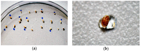 The petri dishes were prepared by applying one droplet of 2 μL liquid per individual onto the surface of each dish. The droplets were applied using an Eppendorf Research plus pipette with a working range of 0.1–2.5 μL (Eppendorf AG, Hamburg, Germany). Subsequently the mealybugs were transferred directly into the droplets, at a rate of one individual per droplet (see Figure 2a). This procedure was repeated for every test solution (PTW, CAW and TW). The dry reference samples were also transferred to a petri dish. All dishes were closed with their standard cover, no sealant applied, and stored at a room temperature of 20 °C for the duration of the experiment. A vitality assessment was carefully performed after 1 h, 3 h and 24 h, following the same procedure of tactile testing as described above. All consumable materials were purchased from Th. Geyer GmbH & Co. KG, Renningen, Germany.