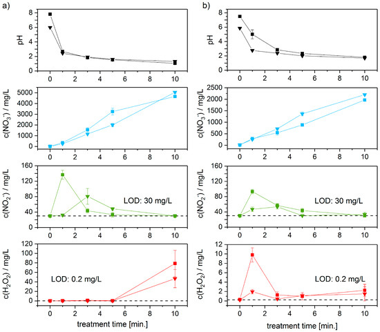 Development of concentration of pH, nitrate, nitrite and hydrogen peroxide due to CAP-treatment of (a) 1 mL treated liquid volume and (b) 3 mL treated liquid volume. The ■ data points show the behaviour of regular tap water (n = 3), whereas the ▼ data points depict the behaviour of deionized water (n = 3). Reducing the liquid volume from 3 mL to 1 mL the necessary treatment time to obtain comparable values of pH, nitrate, nitrite and hydrogen peroxide is reduced to 1/3, accordingly.