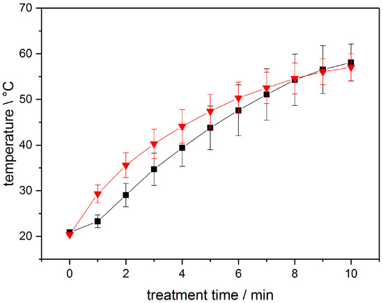 Temperature behaviour of 1 mL (red graph) and 3 mL (black graph) liquid during a plasma treatment using the setup displayed in Figure 1 (n = 3).