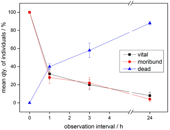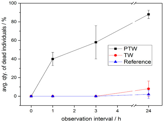 Figure 5 displays three different vitality states of the treated insects during the PTW experiments. The insects rated to be in the vital state are showing immediate response to the tactile tests (see Section 2.4). When only showing retarded reaction to tactile testing, the insects are registered in the group of moribund individuals. The individuals that show no reaction to the tactile tests as well as no movement of extremities are assigned to dead group. Depicted in Figure 6 are the MR of the PTW treated samples compared to the reference samples that were treated with regular TW as well as compared to the dry reference samples.
