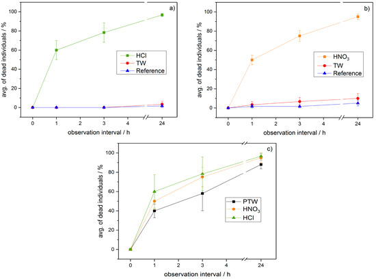 Mortification rates achieved using HCl (a) and HNO3 (b) compared to untreated reference samples as well as (c) direct comparison of the mortification rates of CAW/PTW; pH of 1.8 for all liquids tested. The significance of differences between the treatment methods were tested globally by one-way-ANOVA+Bonferroni, α = 0.001: (a) HCl/TW: p = 1.52 × 10−6, (σ = 1); (b) HNO3/TW p = 1.52 × 10−6, (σ = 1). (c) HCl/PTW: p = 0.008, (σ = 0), HNO3/PTW p = , (σ = 0); HNO3/HCl p = 1, (σ = 0).