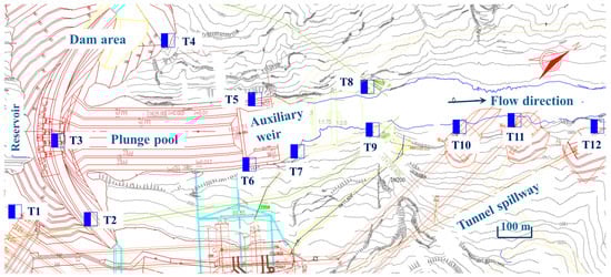 The observation points are distributed along the river valley from the dam area to the downstream location which is approximately 1.25 km away from the dam body. The number of observation points is 12 in total (T1–T12 in Figure 1). The observation work has been carried out at least twice at the same point under the same discharge conditions. The sampling time of the observed LFN data is set as 3–6 min. The sampling frequency is set as 600 Hz. Table 1 shows the details of the observed discharge conditions.