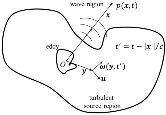 where denotes the vorticity vector in which is flow velocity vector; is ambient density. The vortex sound equation is a typical nonhomogeneous wave equation, with the differential expression of the propagation process of the acoustic wave in a nonhomogeneous fluid on the left hand and the acoustic source term of the vortex on the right hand. Equation (1) indicates that the flow-induced acoustic pressure is directly related to the sizes and motion of the vortices. For an example refers to an unsteady low Mach number flow in free space, the general solution of Equation (1) for the far field is expressed as follows using the Green function method []: