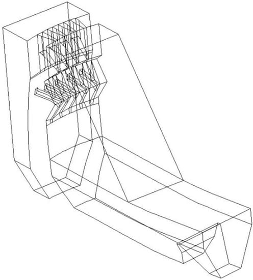 The numerical turbulent flow model established is a 1:1 scale simplified arch dam of Jingping, as shown in Figure 3. The conditions calculated have been shown in Table 1. The simulation domain includes the water body extended 50-m into the upstream reservoir, the arch dam segments with the bottom orifices and crest overflowing orifices, the discharge nappe area in the air, the plunge pool and the water body 40-m long after the tail-weir. The model is meshed by block-structured grids with the grid size 2 m long × 1 m wide × 1 m high. For the main flood discharge and energy dissipation regions, such as the bottom discharge orifices, the crest overflowing orifices, the falling nappe area in the air and the first half of the plunge pool, the grid size is set as 1 m long × 1 m wide × 1 m high, and the mesh refinement method adaptive to the variations of the pressure gradient and free water surface is employed during the calculation. The total number of grid units is approximately 2 million. The finite volume method is employed to build the discrete equations. The PISO method is employed to do the pressure-velocity coupled calculation. The wall function method is used to calculate the near-wall flow field.