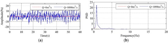 Figure 4 compares the time history and power spectral density (PSD) curves of the LFN observed at T11 between the no-releasing discharge condition (Condition 1) and Condition 2 in Table 1. It can be seen that the LFN intensity greatly increases during the flood discharge, and the acoustic energy mainly concentrated within the frequency domain of 10 Hz. It is obvious that LFN is induced in the process of flood discharge.