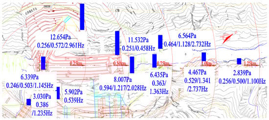 The spatial distribution of the LFN along the downstream area is analyzed. Figure 5 shows the spatial distribution of the LFN amplitude observed in Condition 6. The LFN amplitude of eight observation points located along the right bank side (T1, T2, T6, T7, T9, T10, T11, and T12) has been measured and shown in Figure 6. It gets the maximum near the energy dissipation area (T6) in the plunge pool. The amplitude of LFN decreases gradually with increasing distance away from the energy dissipation area. According to the calculation of statistical average, the LFN intensity in the flood discharge and energy dissipation area (within a range of 500 m downstream from the dam body) attenuates at a rate of approximately 0.0411 Pa/m (0.0311 dB/m), which decreased to 0.00586 Pa/m (0.00716 dB/m) at a range between 500 m and 1250 m downstream from the dam body.