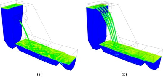 In this study, free surface of water in the flow field is determined by air volume fraction of 0.6. Figure 8 shows the flow regime of the whole calculation region of Conditions 2 and 6. As the VOF method is based on the assumption of no-rupturing and no-mixing between air and water, it is difficult to simulate the diffusion of the nappe. As a result, the free surface of the nappe in the numerical results is slightly different with the actual situation. However, the general track and form of the movement of nappes in the air are coincided with physical truth.