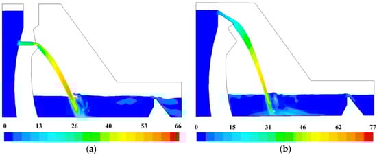 In actual calculation, the bucket angles () of 3# crest overflowing orifice and 3# bottom discharge orifice are −41.67° and −45.00°, respectively. Table 3 lists some comparisons of numerical and the theoretical results of nappe trajectory length and water-entry velocity. It can be seen that the theoretical results of nappe trajectory length are slightly larger than numerical results, as the theoretical equation considered the aeration and spallation of the jet. The numerical results of water-entry velocity are less than the results of free projectile theory, as the theory has not considered the influence of air resistance. Nevertheless, the relative error between numerical and theoretical results is less than 3.5%. It validates the accuracy of the numerical simulation results, and lays the foundation for further analysis.