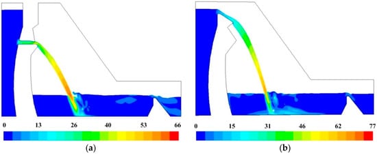 Velocity contours of the surface and deep outlet’s mid-line sections (the unit is m/s): (a) Condition 2; (b) Condition 6.