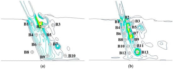 Vorticity contours in energy dissipation area (the unit is s−1): (a) Condition 2; (b) Condition 6.