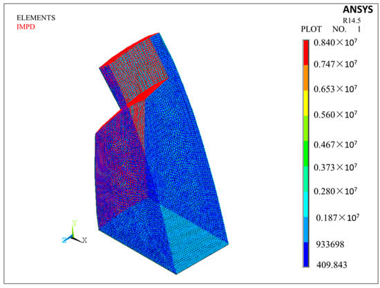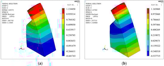 Acoustic mode is a unique property of the air medium [,], which is mainly related to the shape and location of the air cavity. Because the air cavity is a vibration system with its mass and compressibility, it has a series of modal frequencies and modal shapes. When a periodic exciting force acts on the cavity and the exciting frequency coincides with certain natural frequency of the cavity, the acoustic resonance occurs. The characteristic parameters of cavity acoustic modes, which are the eigenvalues of the acoustic mass and stiffness matrixes in Equation (9), can be calculated by the acoustic FEM. Then, Equation (7) leads to: