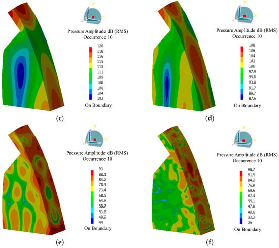Contours of acoustic pressure of cavity under different frequency of Condition 6: (a) f = 0.55 Hz; (b) f = 1.50 Hz; (c) f = 2.25 Hz; (d) f = 3.00 Hz; (e) f = 7.00 Hz; (f) f = 15.00 Hz.