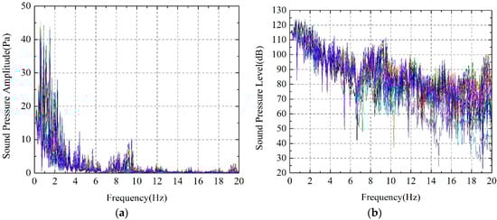 Frequency response functions of acoustic pressure of observation points: (a) Acoustic pressure; (b) Acoustic pressure level.