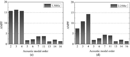 Acoustic modal participation factors of peak frequency of: (a) 0.55 Hz; (b) 1.15 Hz; (c) 1.50 Hz; (d) 2.25 Hz.