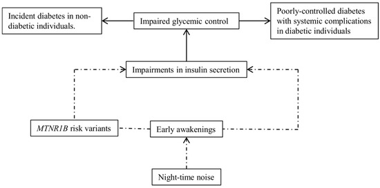 Melatonin, a pineal hormone known to act on numerous organs and co-regulate various neural and endocrine processes, exhibits a circadian rhythm which is closely linked to sleep propensity [17] and insulin secretion [18]. Administration of exogenous melatonin elicited subjective sleepiness [19] and glucose intolerance when given close to mealtime [20]. Melatonin mediates its regulatory function through binding to receptors including the high-affinity melatonin receptor 1B encoded by MTNR1B, a gene widely expressed in the human retina and pancreatic islet cells. Recent genome-wide association studies (GWAS) showed seven common variants near MTNR1B to be associated with glucose homeostasis or type 2 diabetes, mainly through impairments in insulin secretion [21]. The glucose-raising allele of the lead variant, rs10830963, was shown to significantly prolong the duration of elevated melatonin levels by 41 min, and delayed the circadian phase of dimlight melatonin offset by 1.37 h, as well as increased diabetes risk among individuals who woke up early [22]. Individuals who are evening chronotypes were also shown to have higher risk of diabetes [23]. In both instances, it is thought that waking up early or sleeping late (during high melatonin and low insulin phase) predisposes to having meals, leads to high insulin levels and subsequent hyperglycemia, as a result of altered timing of food intake. Thus, the glucose-raising allele of rs10830963 could modify susceptibility to noise exposure in cases of early awakenings during melatonin secretion (Figure 1).