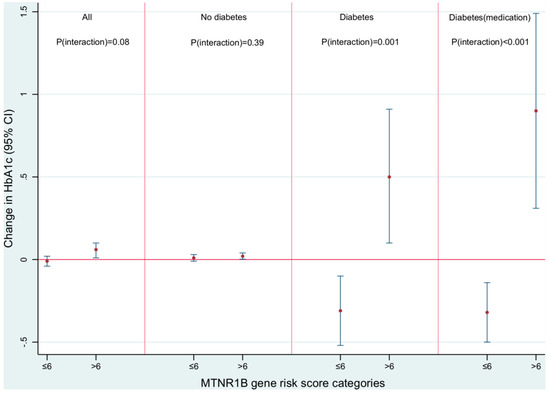 Although we observed statistically significant associations between RTN and mean ΔHbA1c among non-diabetic participants with high MGRS, the difference in associations between non-diabetic participants with high and low MGRS was non-significant (Pinteraction = 0.39) (Figure 2).