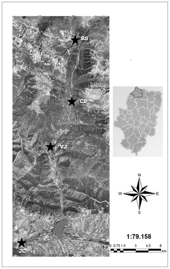 Two sampling points were located in zone 1 because of the high salt dosage registered, which marked this zone as the most relevant study area. In contrast, zones 2 and 3 were areas with moderate and low dosages of salt, respectively. Zone 3 sometimes even exhibits a minimum contribution of de-icing salt, depending on how severe the winter has been. Zone 2 corresponds to a sampling point where there is no agricultural activity, while zone 3 is close to the Jaca urban zone. There, at least once a year the zone has agricultural activity. Figure 1 shows a map with the locations of the RS (Rioseta (sampling point)), CP (Canfranc (sampling point)), VJ (Villajuanita (sampling point)), and JC (Jaca (sampling point)).