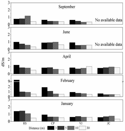 The RS case exhibited high EC values at 3 m in January and February. In fact, an extremely high EC value was noted at 3 m in February (around 9.2 dS/m). This value can be attributed to an enormous amount of salt visible to the naked eye beside the road forming a kind of wall at 3 m. Moreover, the EC values corresponding to the month of January at 3 and 5 m were higher compared to values for the farther distances of 10 and 30 m. For RS, EC at 3 m then decreased over the subsequent months to reach a value below 1.0 dS/m. A similar behaviour was also observed at 5 m.