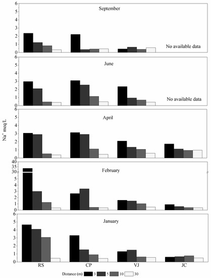 Moreover, lower influence of de-icing salt was observed for the CP case, where lower EC values were measured in February relative to RS. Similarly, the EC decreased with distance from the road and with time. In contrast, significant differences were not observed for the VJ and JC zones; therefore, these results may be associated with soil composition and the seasonal development of soils. These findings can also be attributed to the geographical context of these zones, because they are located farther south where little salt was needed for de-icing. The above is corroborated by Figure 3, which shows the profiles of soluble Na+.