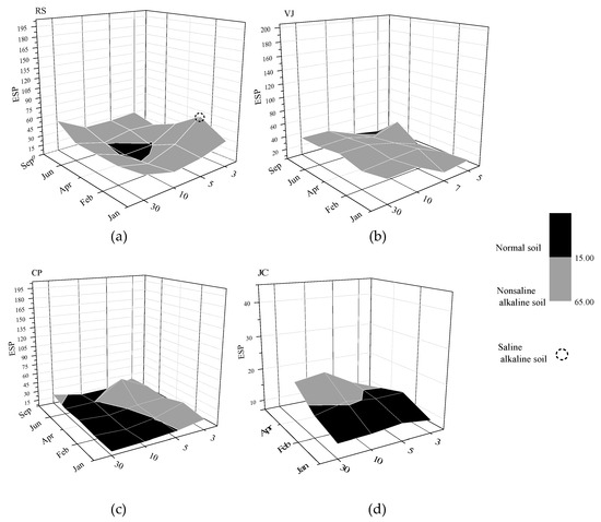 Figure 4a–d show the profiles of the soils affected by de-icing salt along 3–30 m transects for the studied zones. The zones most affected were RS and VJ, as indicated by ESP values higher than 15 during some of the studied months along transects studied, even comparing with data reported by the CSPS (around 3.3). In contrast, the RS case had non-saline alkaline soil during most of study period (January–September). However, saline alkaline soil was recorded in February 3 m from the road (with ESP and EC around 60 and 9.0 dS/m, respectively). This finding may be attributed to the fact that large amounts of de-icing salt were used in that month. Moreover, ESP at 3 and 5 m decreased over time (January–September) and achieved lower values of ESP, but remained above 15, whereas EC dropped below 2 dS/m (Figure 2). Nevertheless, ESP dropped dramatically below 15 at 10 m in April to generate a normal soil (see Figure 4a); then, ESP rose again in June and September, with high ESP values observed at 30 m. This behaviour can be attributed to the displacement of Na+ cations caused by movement farther from the road; consequently, it was more likely to remain in the pores of the soil clay. The possibility of accumulation of this cation from the previous year should also be taken into account.