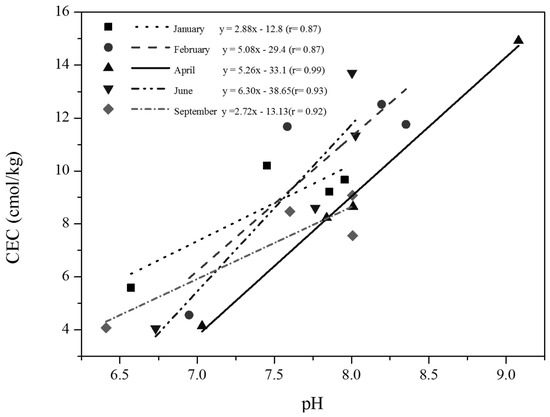 The CEC helps to characterise the soil types under consideration through ESP, because CEC is in turn related to negative charge. Permanent negative charge is located within the structure of clay particles, whereas variable charge is located on the edges of clay and organic matter particles. Therefore, the CEC used for ESP calculation, measured in a laboratory, indicates the ability of a soil to hold cations against leaching [25]. Moreover, a linear relationship was found between the CEC and pH along transects of the RS zone in each month of the studied period (Figure 5). Thus, despite of the low organic matter content, it may be possible that there is enough variable negative charge in the RS zone. The primary factor affecting variable charge is pH; high pH increases CEC. In fact, soil CEC can be expected to increase by up to 50% if the pH is changed from 4.0 to 6.5, and to nearly double if the pH is increased from 4.0 to 8.0 [31]. Thus, the relationship between CEC and pH can help to explain the variability of the amount of organic matter in zone 1 between RS and CP.