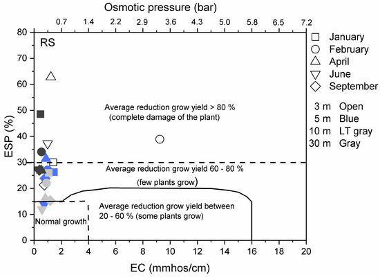 For the point at a distance of 10 m at RS, EC also decreased, but only from January to June (1.1 to 0.5 dS/m), and then increased again to a value of 1.2 dS/m in September. This increment may be attributed to soluble Na+ coming from the area at a distance of 3 m where there was a large amount of salt. In general terms, EC decreased with increasing distance each month, with low values of EC at 30 m (around 0.5 dS/m) and the lowest value in September (around 0.33 dS/m).