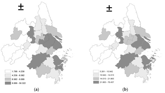 Quaternary Map of the Development of Logistics Industry in Yangtze River Delta: (a) 2005; (b) 2015.