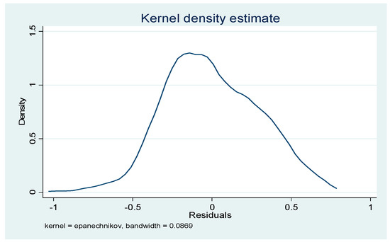As can be seen from Table 6, the statistic of the Durbin-Watson test is 1.960, which is close to the threshold value of 2, indicating that there is no residual serial first-order autocorrelation problem. In response to the possible heteroscedasticity problems, robust standard errors are used in the model. In addition, in Figure 2, which shows Kernel density estimation of residuals, is provided by Stata12.0 software, and indicates that the residuals also approximately obey normal distributions. The joint significance of time-period and spatial fixed LR test rejects the null assumption at 1% level, which indicates that spatial fixed effect and time-period fixed effect should all be considered in the model. At the same time, the results of LM-lag and LM-error reject the null hypothesis at 1% level, Robust LM-lag passes the 1% level of significance test, but Robust LM-error fails the 10% level of significance test. So the model should add a spatial lag item, and the SAR model will be better than the SEM model.