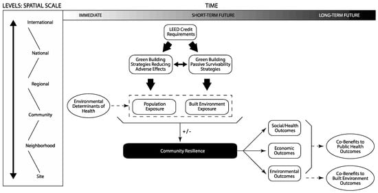 | Sustainable Sites Credit 4.1: Alternative Transportation—Public Transportation Access | Locate building on a site near public transit stops [75,76,77,78,79,80,81,82,83,84,85,86,87,88]. | Disasters Vulnerable Populations | 14 (161) | Ability to evacuate Stress during and after events | Physical and financial access to multiple modes of transportation during an evacuation (particularly to vulnerable populations). Walkability. | Reduced risk factors for obesity (precondition of vulnerability to flooding). Evacuation plan to reduce risk of increased morbidity and mortality among older adults during and after natural disasters. | High mix of land uses. Active community design. Improved access to multiple modes of transportation, particularly for vulnerable populations. |