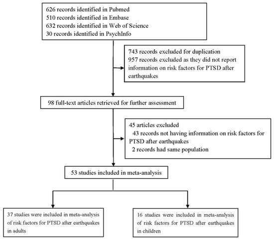 Observational studies (case-control, cross-sectional, and cohort studies) on risk factors for PTSD among earthquake survivors published in English between 1980 (the year PTSD was first included in the Diagnostic and Statistical Manual of Mental Disorders, DSM) and April 2016 were included in this meta-analysis. The following four psychological and medical literature databases were searched: PubMed, Embase, PsycInfo, and Web of Science. Search terms entered into the literature databases included combinations of the following: PTSD or post-traumatic stress disorder; earthquake(s); and risk, predictor, or prediction. A predictor or risk factor was operationally defined as any variable examined as a potential contributor to variability in PTSD symptom levels or diagnostic status. In addition, a manual search of references cited in all relevant original and review articles was conducted. For any full texts not available, we attempted to obtain information from the authors by email. This literature search yielded 886 published articles, which were then reviewed for inclusion in the meta-analysis using various inclusion and exclusion criteria.