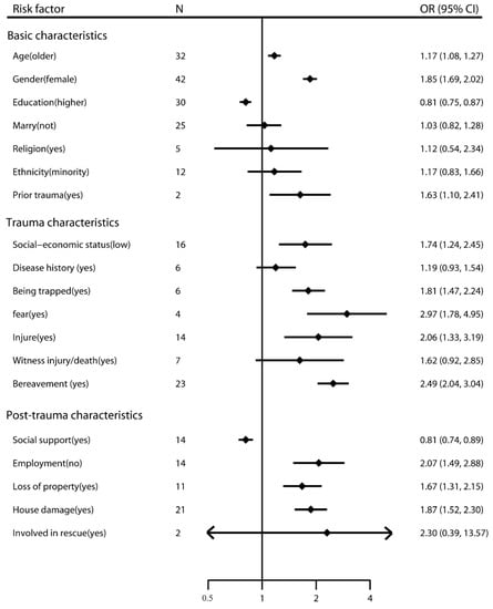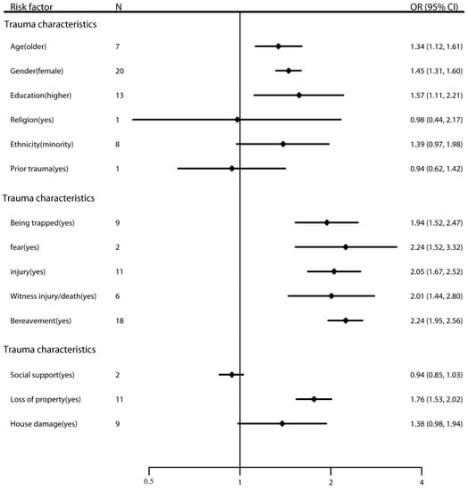 Finally, with regard to the post-trauma characteristics of survivors, only one factor (i.e., loss of property) was found to be a risk factor for the onset of PTSD (OR 1.76, 95% CI, 1.53–2.02). Heterogeneity was found for house damage (I2 = 55.1%, p = 0.023).