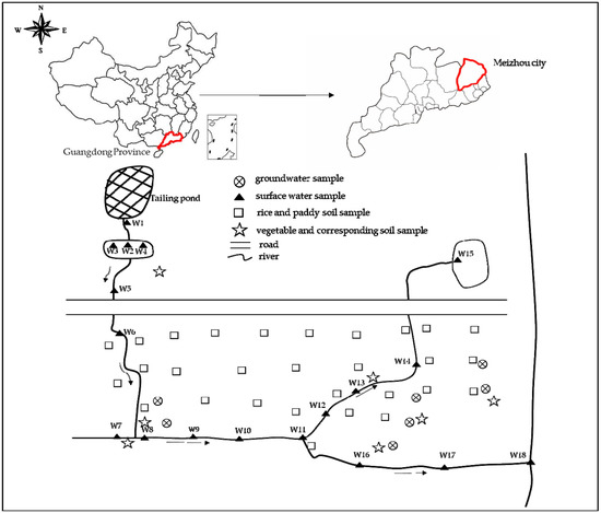 The map of study area and sample point is shown in Figure 1. We collected 18 surface water samples from the river located downstream from the tailing pond, and the water is mainly used to irrigate the crops. In order to investigate the concentration of heavy metals in groundwater in the study area, we collected seven groundwater samples from wells in resident households. According to the investigation in the study area, the groundwater is not used for drinking purposes. Water samples were put in clean polyethylene bottles and the pH was determined immediately. All water samples were brought to the laboratory, acidified with HNO3, and stored at 4 °C before analysis. Crop samples (rice and vegetables) and corresponding rhizosphere soils (0–20 cm) were collected in March and July of 2017. The common vegetables and other crops grown in the study area are rice (Oryza sativa L.), leafy vegetables (including scallion (Allium fistulosum), garlic sprout (Allium porrum), cabbage (Brassica oleracea), water spinach (Ipomoea aquatica Forsskal), sweet potato leaves (Ipomoea batatas (L.) Lam.), Indian lettuce (Lactuca sativa var longifoliaf. Lam), cow soapwort (Vaccaria segetalis Garcke)), and non-leafy vegetables (including cowpea (Phaseolus vulgaris), eggplant (Solanum melongena), capsicum (Capsicum annuum Linn.), and okra (Abelmoshus esculentus)). In a sampling unit, rice and vegetables were collected using the plum blossom sampling method. The corresponding rooted soils were collected using the same method. All samples were put in clean plastic bags and transported to the laboratory for treatment as soon as possible. The vegetable samples were washed with tap water and rinsed with deionized water three times; the surface water was absorbed with filter paper, and the fresh weights (FW) were recorded. The fresh samples were dried at 75 °C to a constant weight in an oven; the dried samples were weighed again, and the dry weight (DW) was recorded to calculate water content. The dried samples were then ground into a fine powder which could pass the 60-mesh nylon sieve and were stored in plastic bags. The edible parts of rice samples were washed with deionized water, ground into fine powder which could pass the 20-mesh nylon sieve, and stored in plastic bags. The soil samples were air dried, crushed with a mortar, passed the 20-mesh and 100-mesh nylon sieve, respectively, and stored in a dryer until an analysis of soil properties and heavy metal concentrations could be performed.