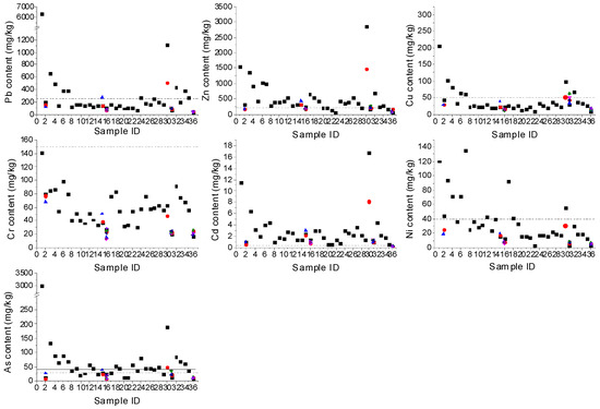 Heavy metal concentrations in all soil samples. Notes: Sample ID 1–36 were compiled with increasing distance from the tailing pond, and sample from ID 1 stand for the tailing sample; since some various vegetable soils were collected in a smallish area, the sample ID of these vegetable soils sampled from a smallish area are represented by the same sample ID, we use different colors to represent these vegetable soils; reference lines (dash) are Grad II values of Environmental Quality Standards for Soils in China (GB15618-1995), while reference line (solid) for As is the standard value of paddy soil.