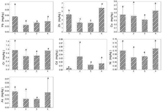 Heavy metal concentrations in four subspecies of non-leafy vegetables (mean + SD) grown in the study area (p < 0.05). Notes: 1 cowpea, 2 eggplant, 3 capsicum, and 4 okra. Letters indicate the level of significant difference at p < 0.05.