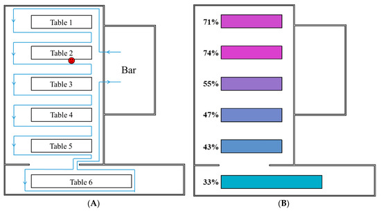 In this study, the guests and waiters were identified as the study objects, and the investigation focused on the infection patterns of the guests. After the outbreak, 83 of 126 guests from six parties were interviewed, 52 of whom reported illness. As shown in Figure 1, the distribution of attack rates showed a statistically significant spatial pattern [21]. The attack rate was highest at Table 2, where the index patient was seated, while the rates at other tables decreased as the distance from Table 2 increased.