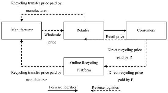 Traditional recycling channels include retailers carrying out recycling and manufacturers carrying out direct recycling, etc. In this study, an online recycling channel is introduced to construct a dual-channel recycling model between retailers and a third-party online recycling platform. Within this context, manufacturer M is the primary leader in the supply chain who manufactures new products and sells wholesale to retailers at the unit wholesale price. The manufacturer also determines the unit recycling transfer price paid to retailer R, and to third-party online recycling platform E for subsequent electronic waste recycling and remanufacturing. Retailer R sells the new products and also competes with the third-party online recycling platform E in the electronic waste market. Based on the unit recycling transfer pricing set by the manufacturer M under the principle of profit maximization, direct recycling pricing is determined by retailer R and the third-party online recycling platform E, individually. The model is illustrated in Figure 1 below.