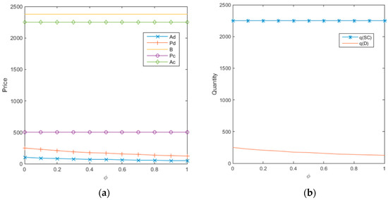 Proposition 4 shows that when revenue-and-expense sharing contracts are coordinated, the optimal pricing strategies of each party are different compared to them before coordination. The most significant change is that the direct payment pricing is now affected by the sharing contract coordination coefficient as compared to being affected by consumer bargaining power without coordination. In addition, the manufacturer’s optimal transfer price is now affected by both the contract coefficient and the consumer bargaining power coefficient. The reason for this new phenomenon is due to the presence of the revenue-and-expense sharing contract, where the manufacturer has given up some profits. Since the manufacturer has shared some of the recycling fee incurred by retailers and the third-party platform, the impact of the consumer bargaining power on them in direct recycling has vanished. This is reflected in the direct recycling price paid by the retailer and online recycling platform, which are no longer affected by the consumer bargaining power coefficient. Moreover, due to the presence of the contractual relationship, the retailer, the online platform, and the manufacturer have formed a unified system from the consumers’ perspective. Therefore, when the manufacturer makes pricing decisions, they will consider consumer bargaining behavior when dealing directly with consumers. The higher the consumer bargaining power, the higher the recycling transfer payment that the manufacturer sets. This conclusion is expressed by the transfer payment equations and .