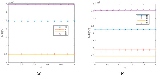 When consumer bargaining power is observed, revenue-and-expense sharing contracts are adopted to achieve the goal of profit coordination among enterprises in the supply chain to alleviate competition among internal members of the supply chain to reduce loss and optimize the profit of the overall supply chain, as illustrated by the profit increase in the overall supply chain in Figure 3a,b above. Sharing contracts among supply chain members strengthens the cooperation among all parties in the supply chain. To ensure profit optimization and strengthen cooperation among enterprises, the manufacturer, being the leader of the supply chain, will have to give up some profits. In this context, the bargaining power of consumers, who are paid for recycling electronic wastes in the supply chain as single individuals, is indeed quite insignificant in the unified enterprise system that plays the leader-role in the supply chain. This argument is supported by the changes in the trends of profit levels for each player and the supply chain illustrated in Figure 3a,b.