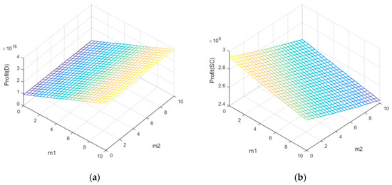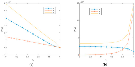 When analyzing the impact of the channel competition coefficient on the overall profit of the supply chain system, the values defined for all other parameters are kept the same as above, except for channel competition. As seen from Figure 4a,b, the optimal profits of the supply chain system before coordination are generated when approaching the interval endpoint. This indicates that when there is channel competition under a dual-channel mechanism, better recycling benefits can be achieved when there is only one channel leader, who is assisted by another channel in handling recycling. On the other hand, after supply chain contracts are coordinated, we can see intuitively from Figure 4b that the profit trends become gentler, displaying an upward trend as channel competition coefficients and increase. This is because the coordination mechanism has lowered the internal competition in the supply chain, increased coordination among all players, and indirectly reduced the competition intensity among different channels.