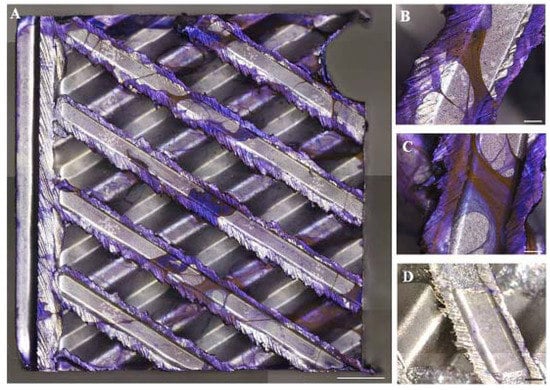 Crystal violet staining (purple) (A): mosaic images acquired by the motorized stereo zoom microscope AxioZoom V.16 (Zeiss). Multiple images of the large samples were merged with ZEN Pro software. Scale bars = 2000 μm (A) and 500 μm (B,C,D). Magnification = 11.2×; (B,C): magnification of a representative area of the medical devices contaminated with bacteria strains; (D): negative control.
