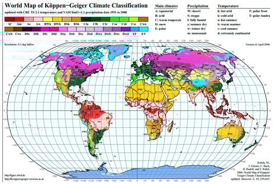 - Kottek, M.; Grieser, J.; Beck, C.; Rudolf, B.; Rubel, F. World map of Köppen-Geiger climate classification updated. Meteorol. Z. 2006, 15, 259–263. [Google Scholar] [CrossRef]