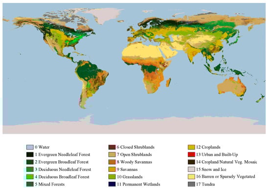 Figure 3. Color-coded land cover classification differentiating 17 types of land cover, ranging from evergreen needleleaf forest to tundra [].