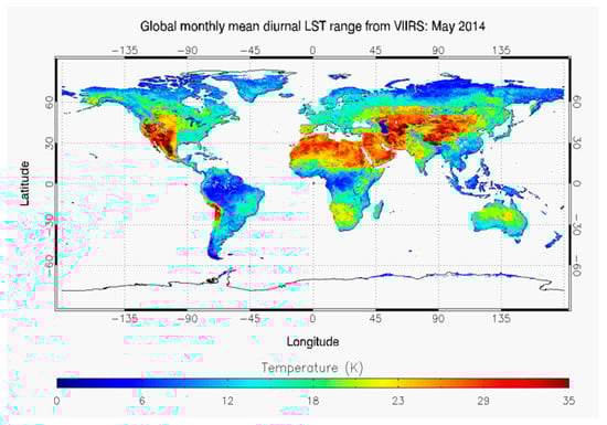 Figure 4. Global Monthly Mean from May 2014 of diurnal range of LST from S-NPP VIIRS [].
