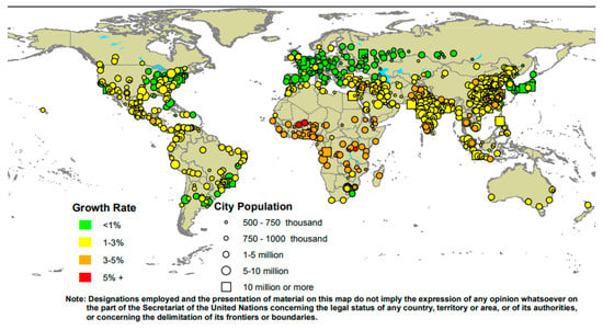 - City sizes. Several studies relate the size of the cities to the magnitude of the UHI [,,]. Others highlight the role of more relevant parameters [,]. The United Nations has mapped the size of cities and their corresponding growth rates [] (Figure 5).