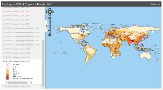 - Population density: Several studies establish a relationship between population density and UHI [,]. The United Nations Socioeconomic Data and Applications Center (SEDAC) produced the The Gridded Population of the World (GPW) series which consist of a set of maps which model the distribution of human population (counts and densities) on a continuous global surface of censuses occurred between 2005 and 2014 (Figure 6).